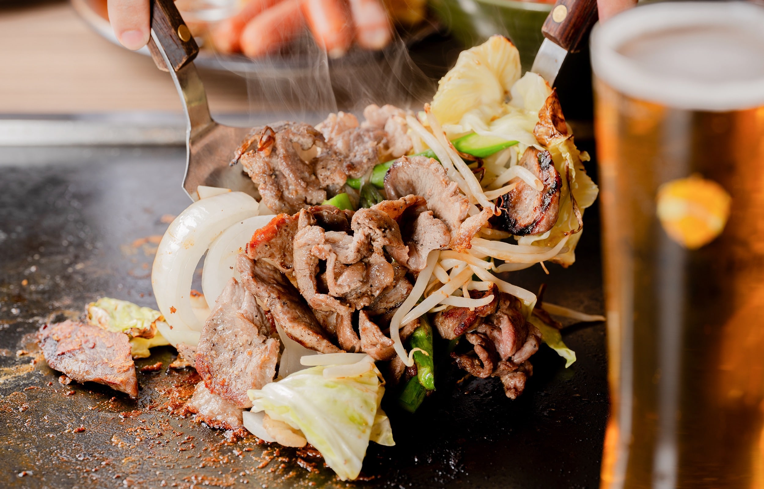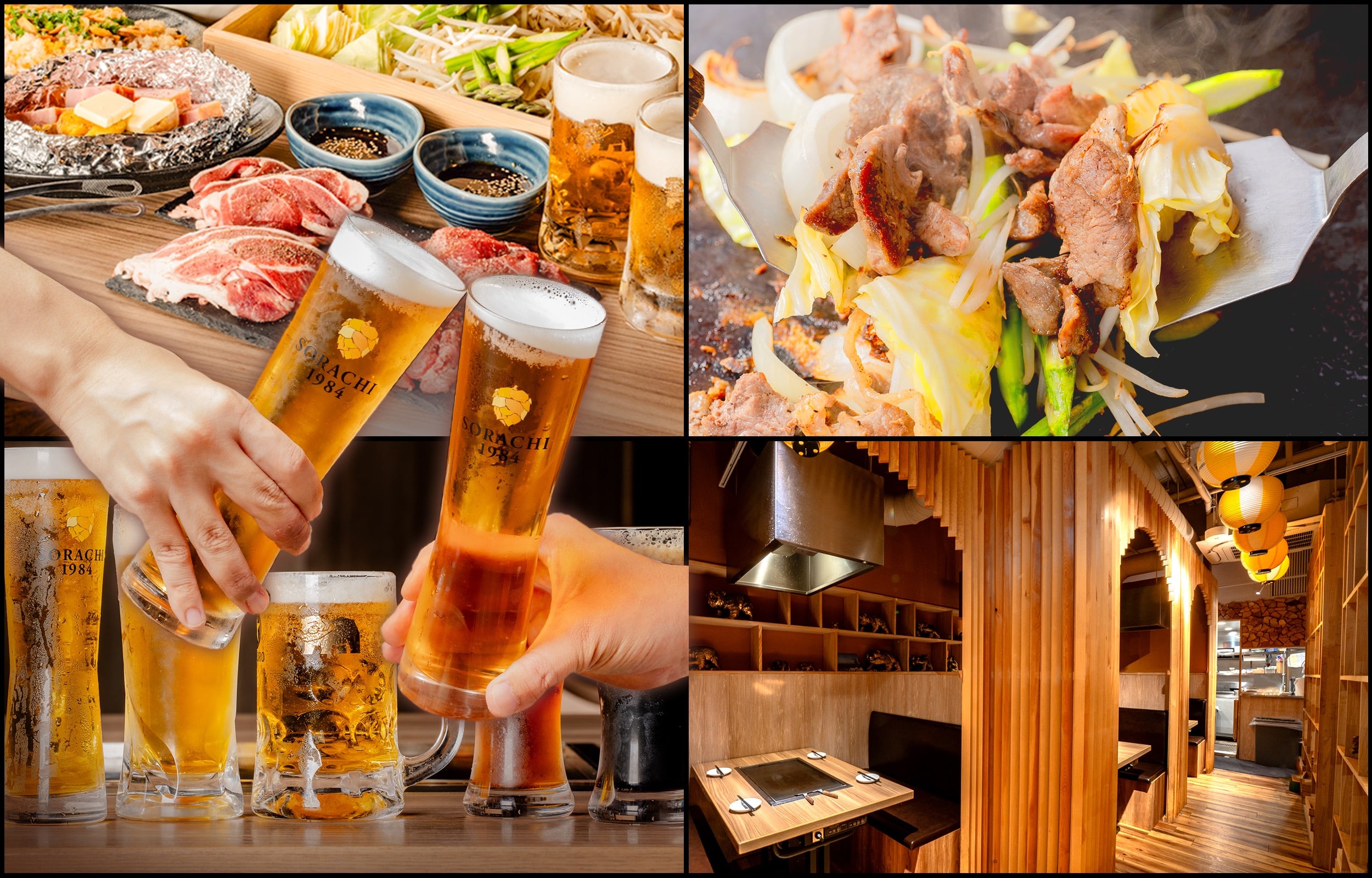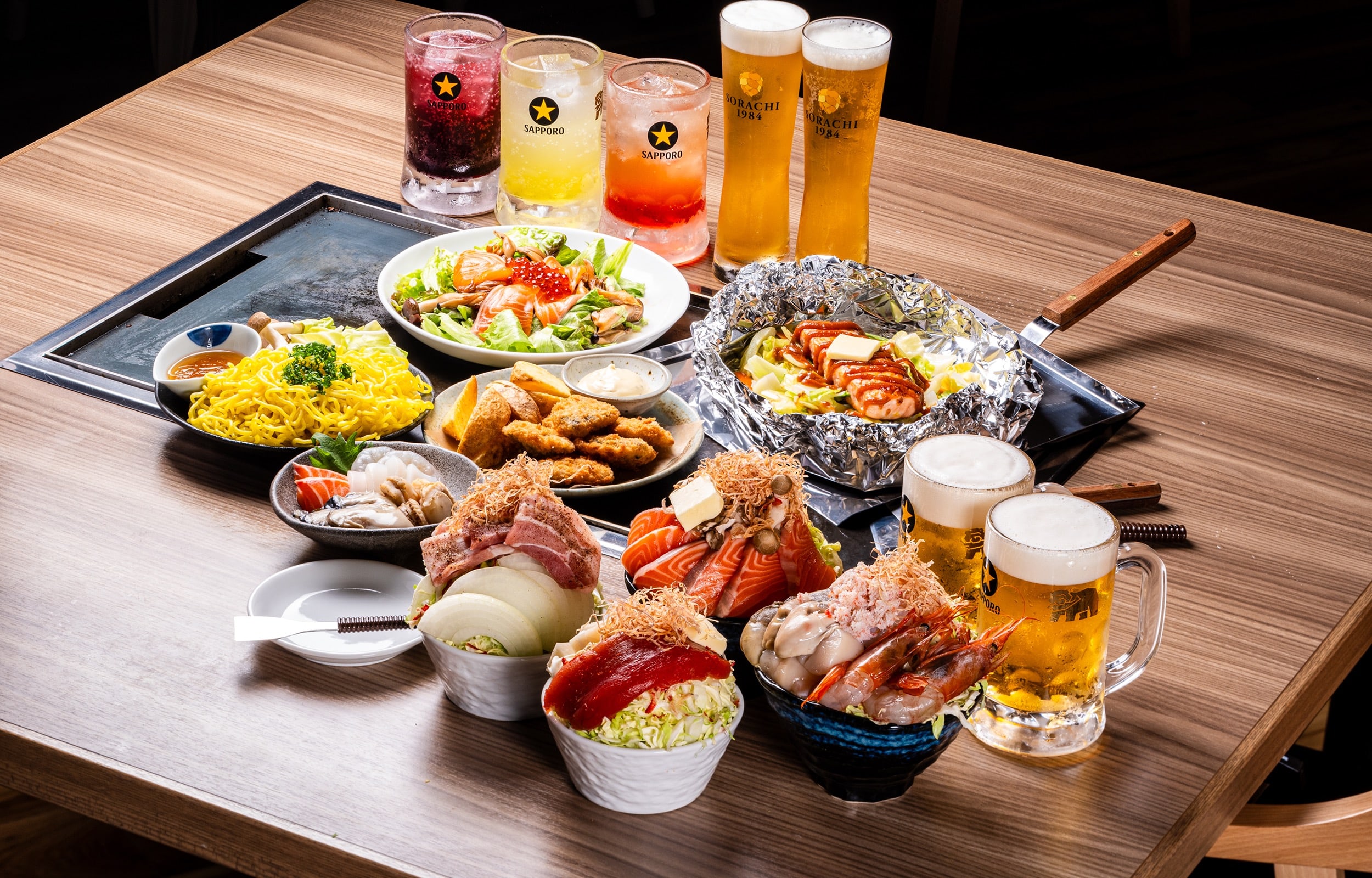 創業50年の北海道ダイニング監修のもと、東京発祥の B 級グルメを道産食材でアレンジした「北海もんじゃ」、北海道産和牛とたっぷり野菜の豪快「鉄板焼き」を2大看板メニュー。