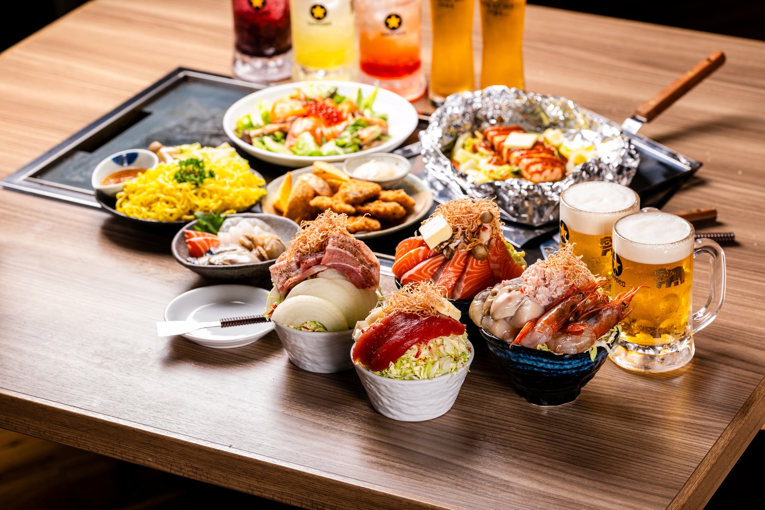 創業50年の北海道ダイニング監修のもと、東京発祥の B 級グルメを道産食材でアレンジした「北海もんじゃ」、北海道産和牛とたっぷり野菜の豪快「鉄板焼き」を2大看板メニュー。